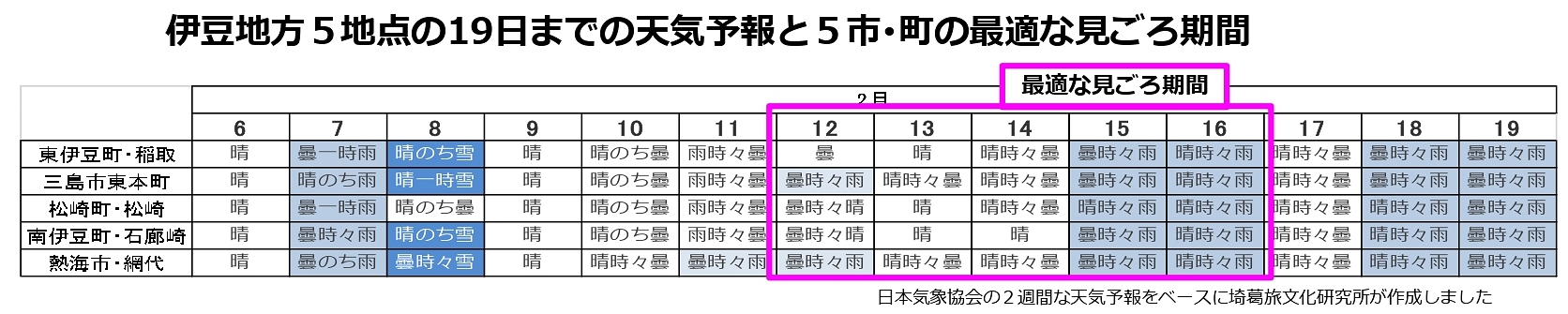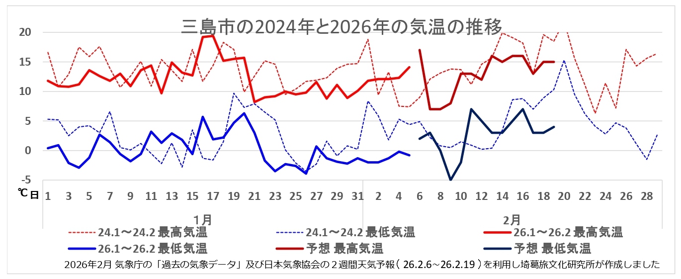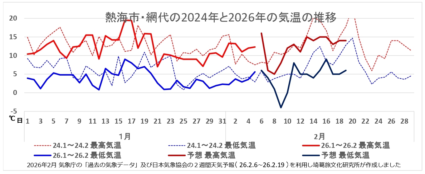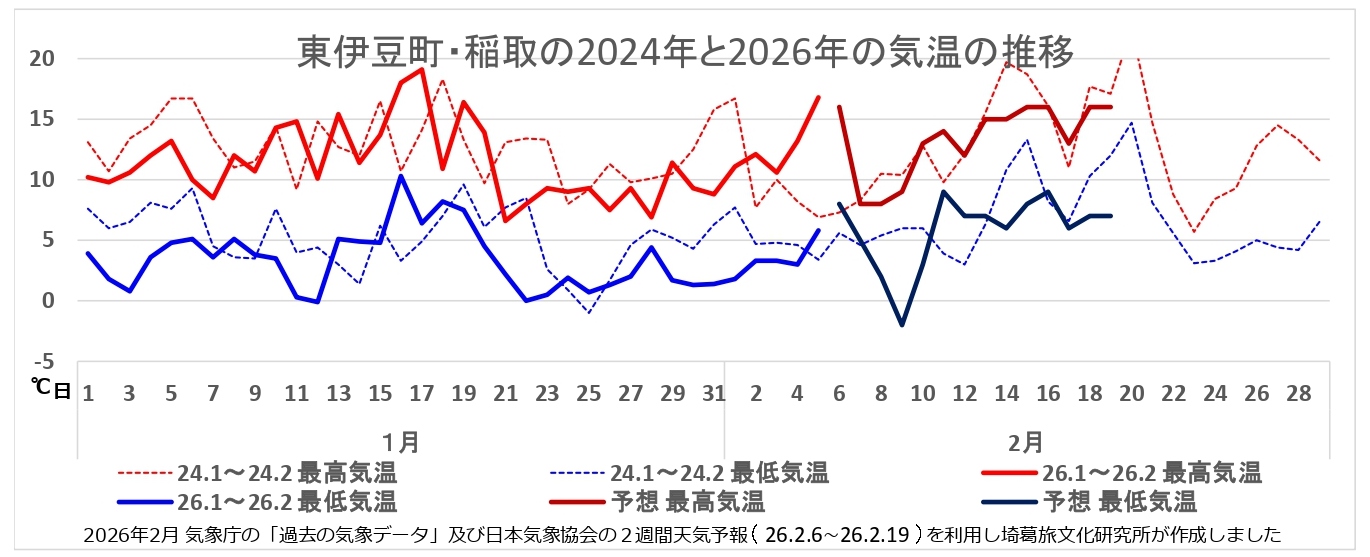 伊豆半島の5地点(三島市、熱海市、東伊豆町、松崎町そして南伊豆町)の1月からの気温の推移(6日から19日までの予測も含みます)から見えたのは?