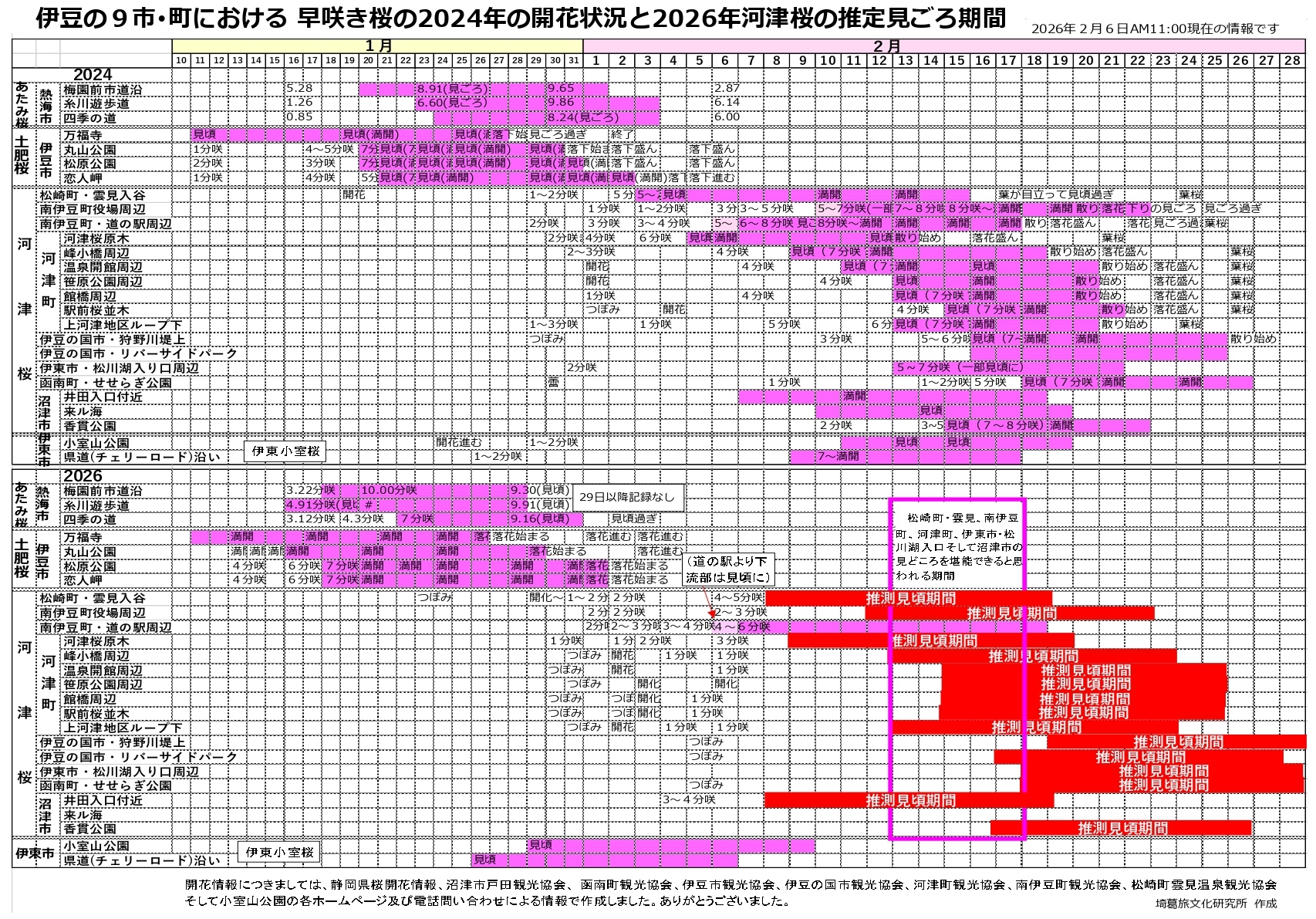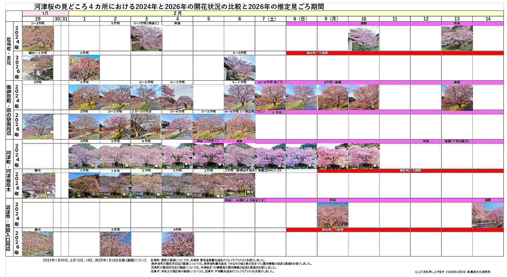 例年早く見ごろを迎える4カ所の2024年と2026年を比較してみました。